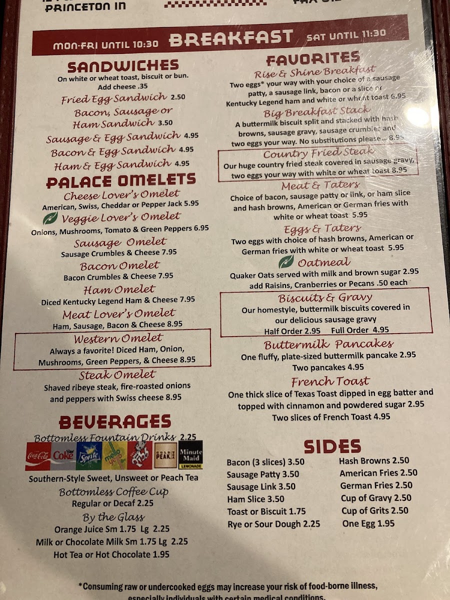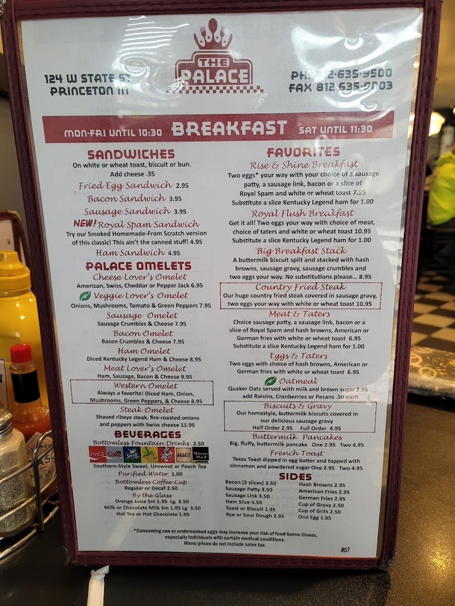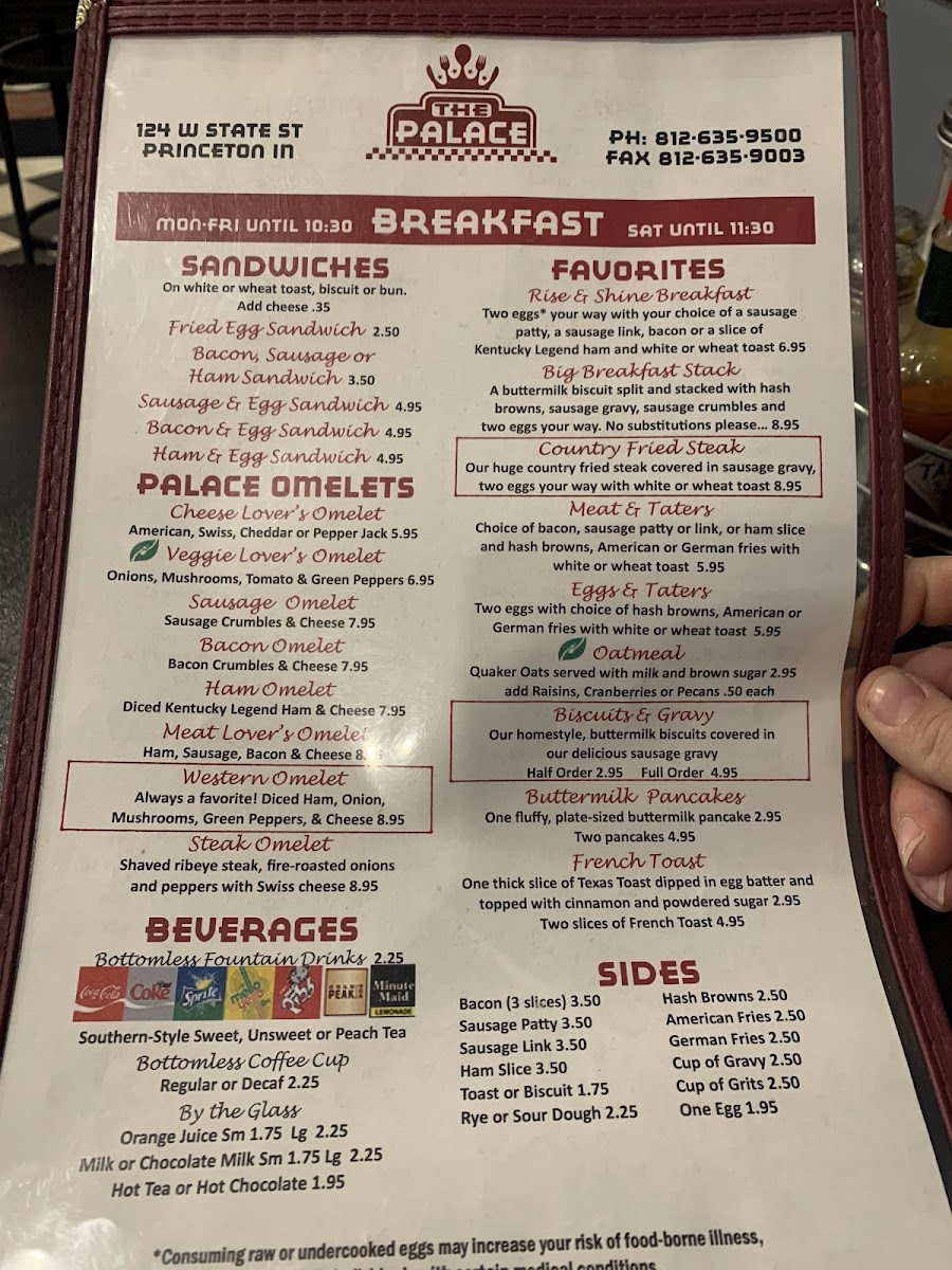 The Palace Cafe Menu offers a delightful variety of dishes that promise to satisfy every craving. Located at 124 W State St in Princeton, IN, this charming cafe is a local favorite for anyone looking to enjoy a cozy meal with great flavors. Whether you're in the mood for a hearty breakfast, a fresh salad, or a classic sandwich, there's something for everyone on the menu. The casual vibe makes it the perfect spot to relax with friends or enjoy a quick bite during your day. Each dish is crafted with care, using quality ingredients that elevate every bite. From their signature house-made soups to flavorful pastas and decadent desserts, The Palace Cafe Menu brings a comforting yet exciting dining experience. The friendly staff and inviting atmosphere only add to the overall experience, making it a place you'll want to come back to time and time again.